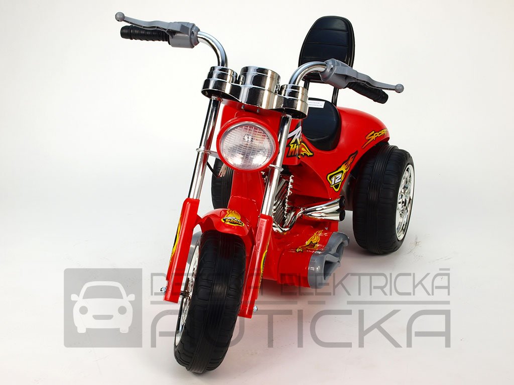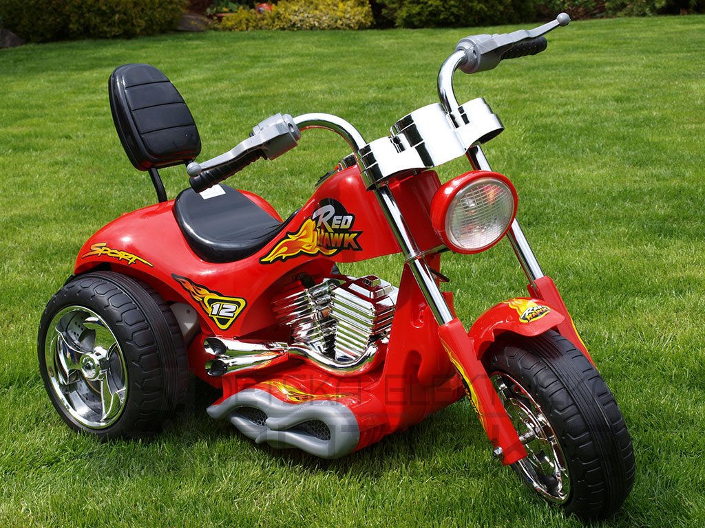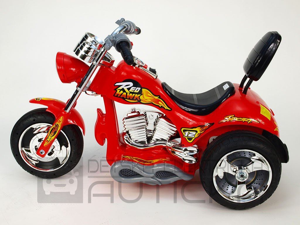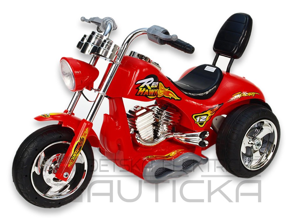 Výkonná elektrická motorka chopper Red Hawk má masivní kovovou konstrukci, která je doplněna o prvky z velice odolného plastu. Má náhon na obě mohutná zadní kola (jízda také v lehčím terénu), která jsou opatřena gumovým pruhem pro tichou a pohodlnou jízdu. Nadchne Vás také její originální vzhled a kvalitní zpracování i těch nejmenších detailů. O pohon se starají 2 motory 45W / 12V.