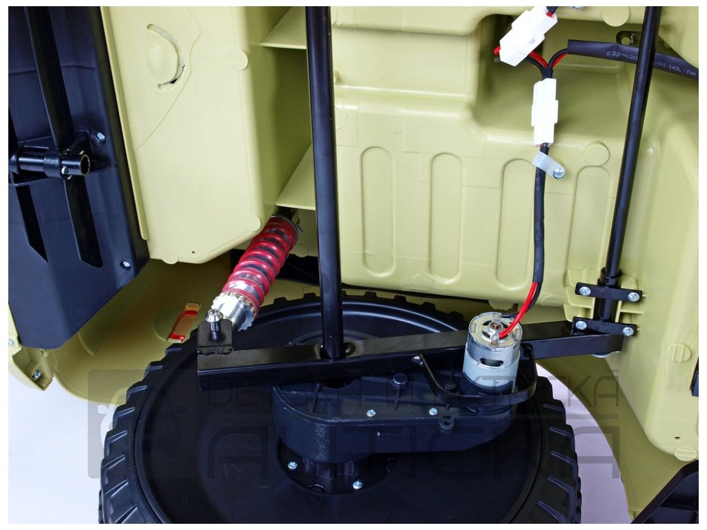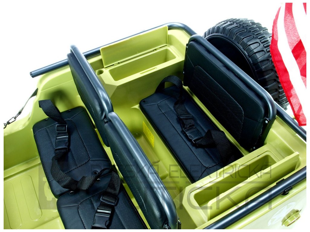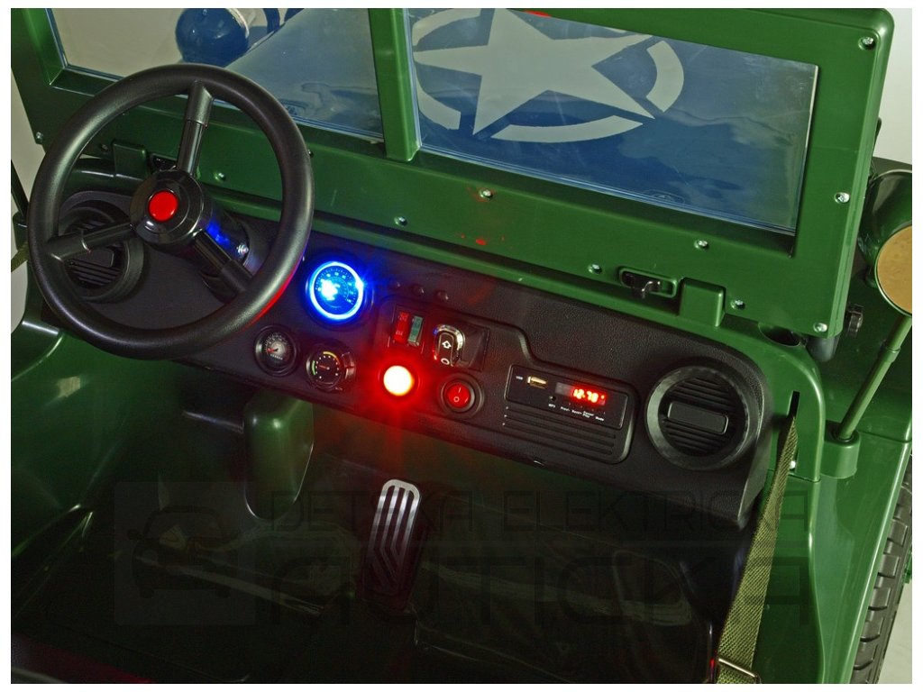 Džíp pohání čtyři elektromotory o výkonu 90W / 24V, které jsou připojené na výkonnou baterii 24V / 7 Ah. Kvalitní velká EVA kola s ložisky se postarají o příjemnou jízdu a pohodlí zajistí odpružení přední nápravy a stavitelná tuhost tlumiče na zadní nápravě. Potěší i 3 čalouněné sedačky s bezpečnostními 3 bodovými pásy. Vhod přijde i zadní výsuvné madlo pro odtažení. V zadní části vozu jsou mimo vlajky USA i otevíratelné schránky s prostorem na drobnosti. Džíp má sklopné přední sklo.