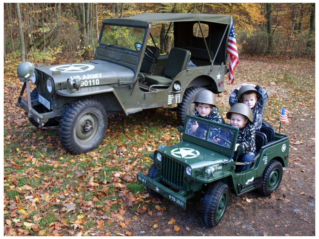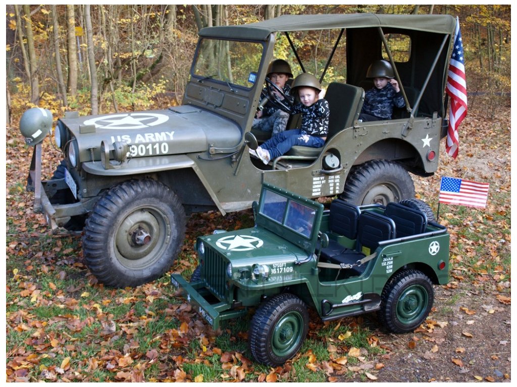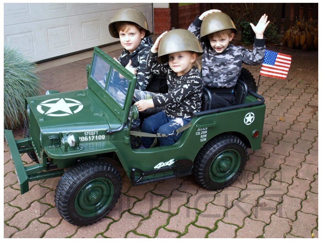 Představujeme vám jedinečný trojmístný vojenský džíp Jeep Willys 4x4! Opravdovou legendu 2. světové a Korejské války. Unikátní džíp v macha army barvě je ovládaný buďto přes pedál umístěný v autíčku, kde je možné jezdit dvěma rychlostmi vpřed a dvěma vzad nebo přes 2.4G dálkové ovládání, které má vždy přednost před řízením dítěte - tzn. džíp můžete kdykoliv okamžitě zastavit tlačítkem na ovladači. Při nesešlápnutém pedálu nahrazuje tah motorů brzdu.