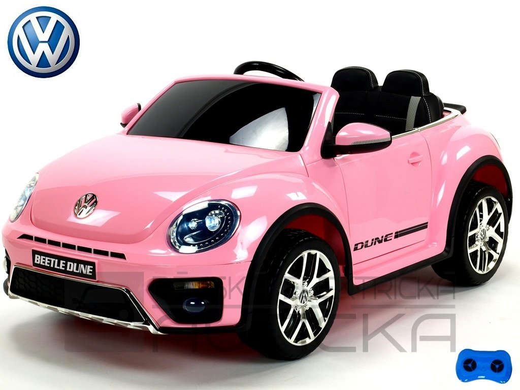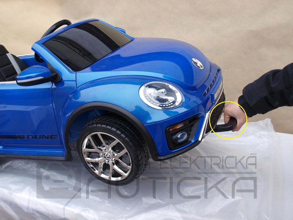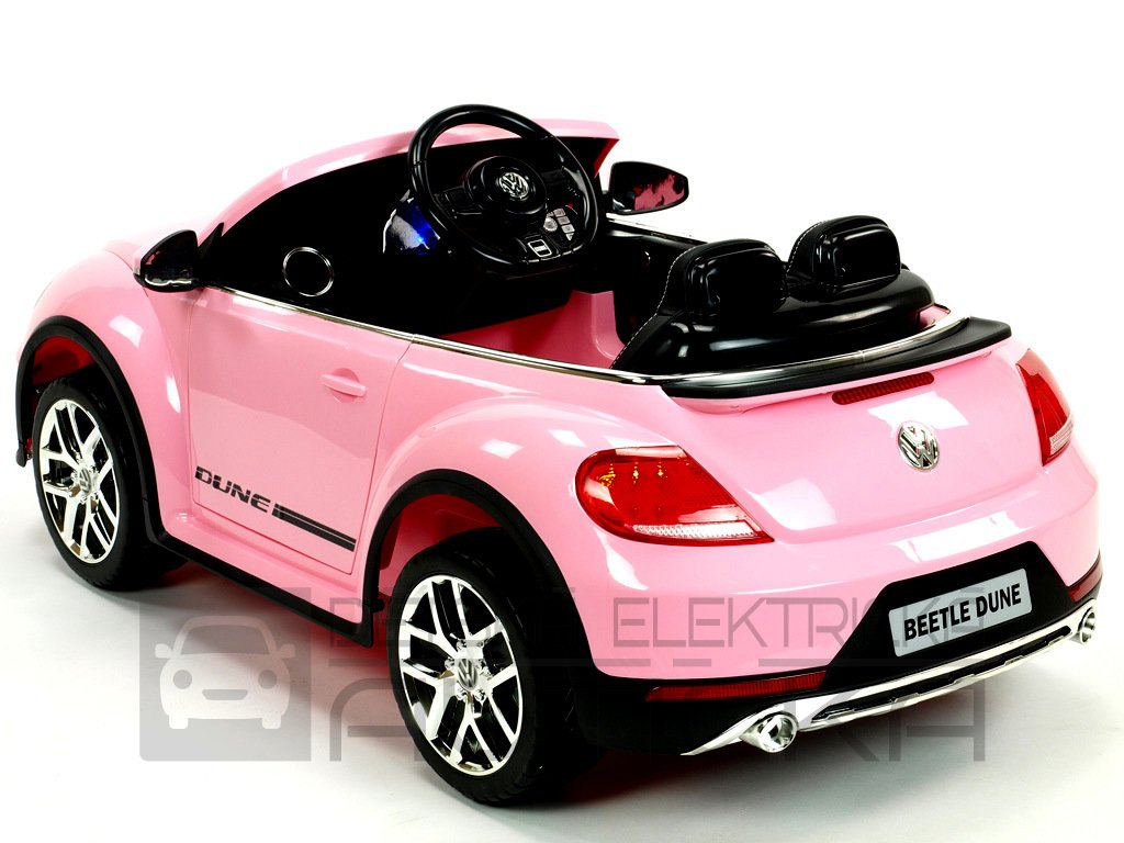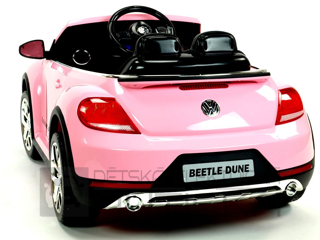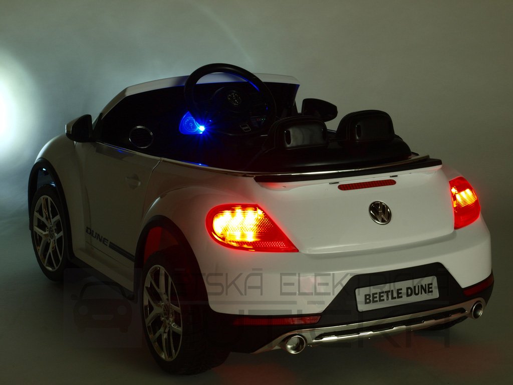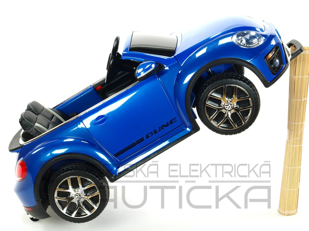 Neotřelý design legendárního Beetla, kvalitní lakovaný materiály a špičkové spracování. To je VW Beetle Dune cabrio se dvěma motory 45W / 12V s náhonem na obě zadní kola (zvládá i jízdu po nerovnostech), pérováním obou náprav a 3 rychlostmi vpřed i vzad. O příjemnou jízdu se starají také krásná čalouněná sedačka a tichá EVA gumová kola.