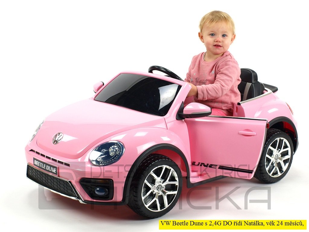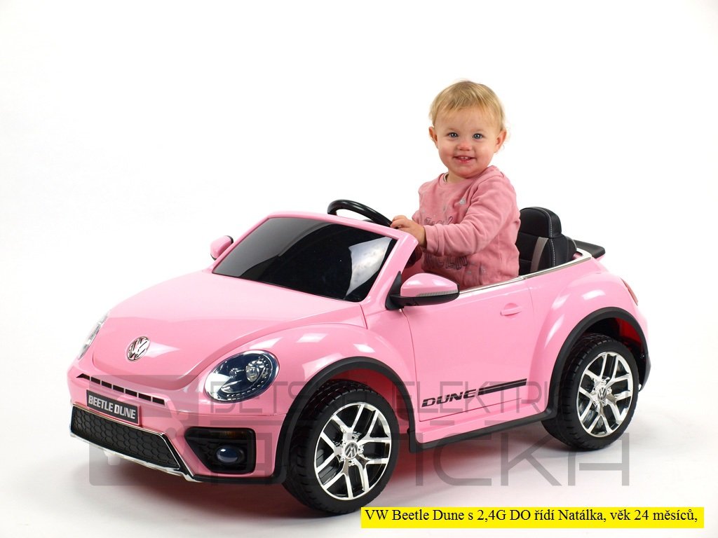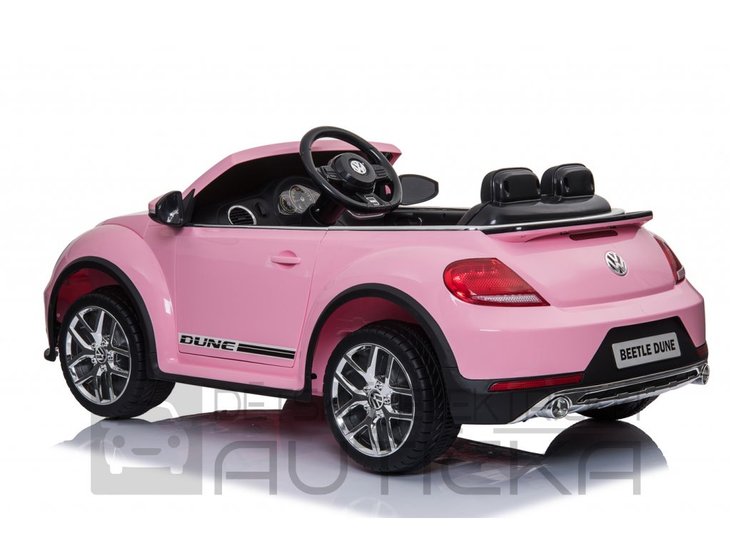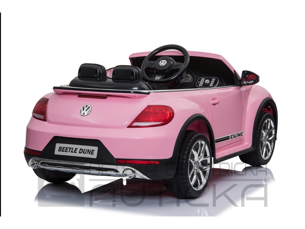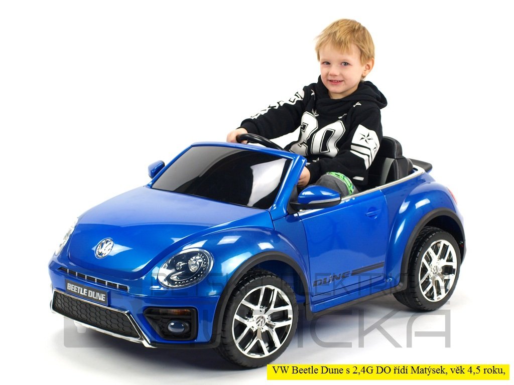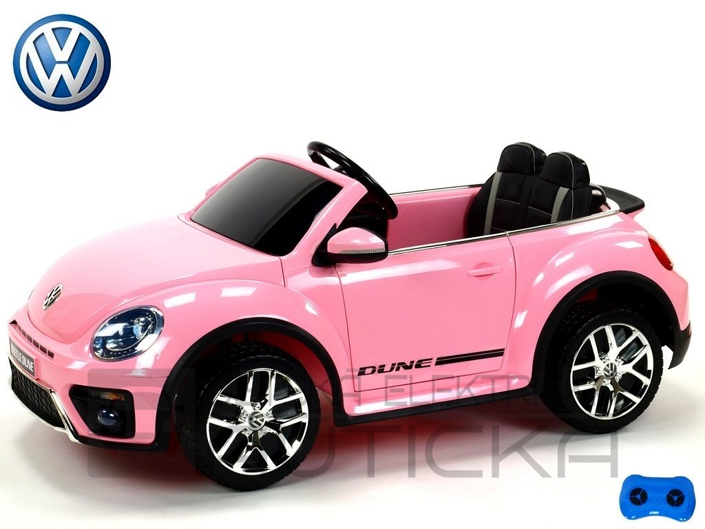 Neotřelý design legendárního Beetla, kvalitní lakovaný materiály a špičkové spracování. To je VW Beetle Dune cabrio se dvěma motory 45W / 12V s náhonem na obě zadní kola (zvládá i jízdu po nerovnostech), pérováním obou náprav a 3 rychlostmi vpřed i vzad. O příjemnou jízdu se starají také krásná čalouněná sedačka a tichá EVA gumová kola.