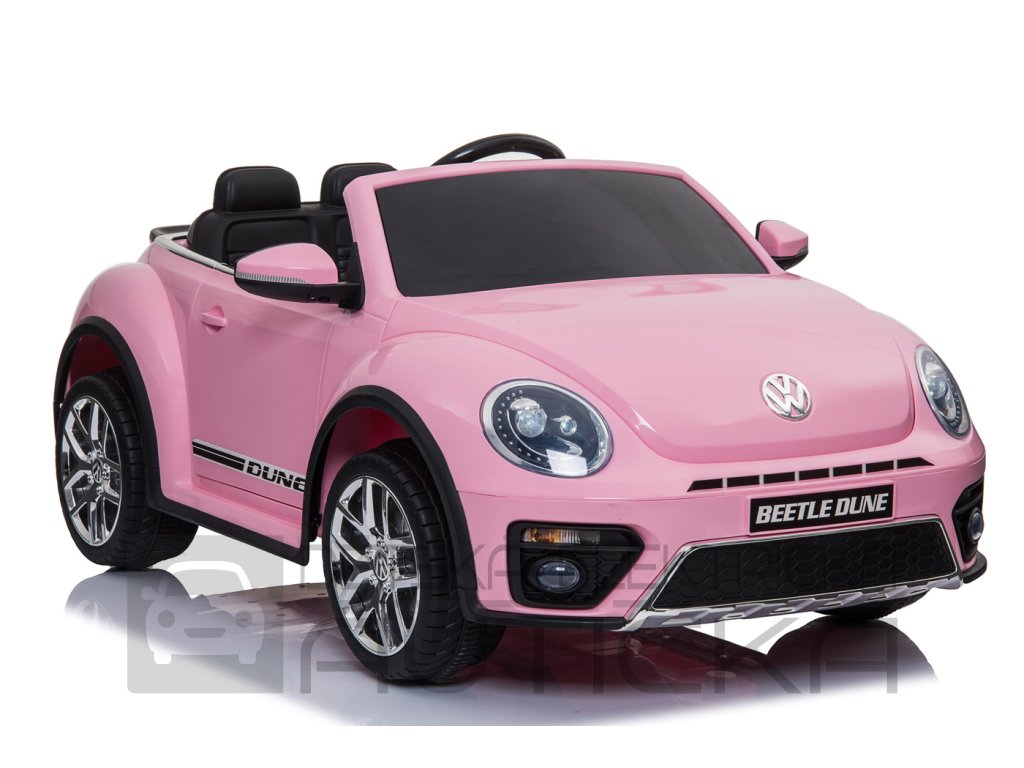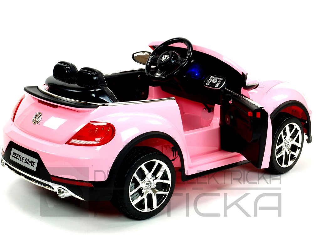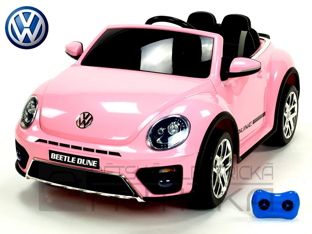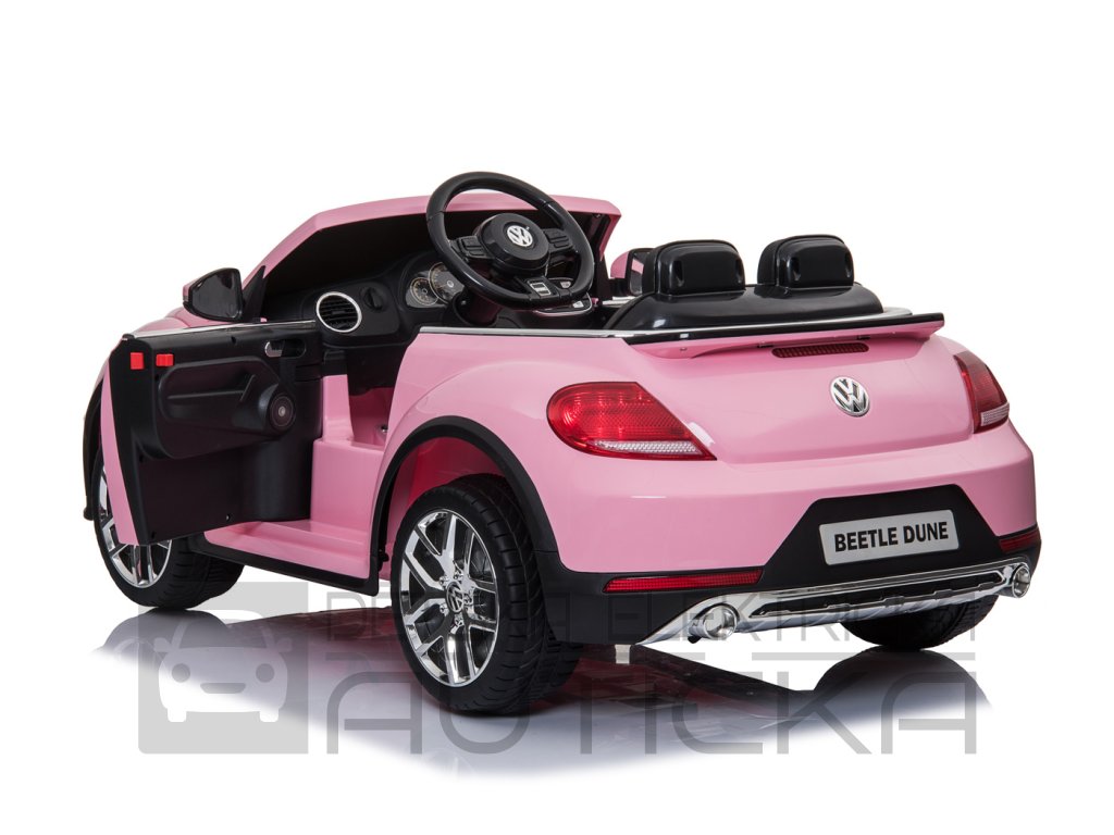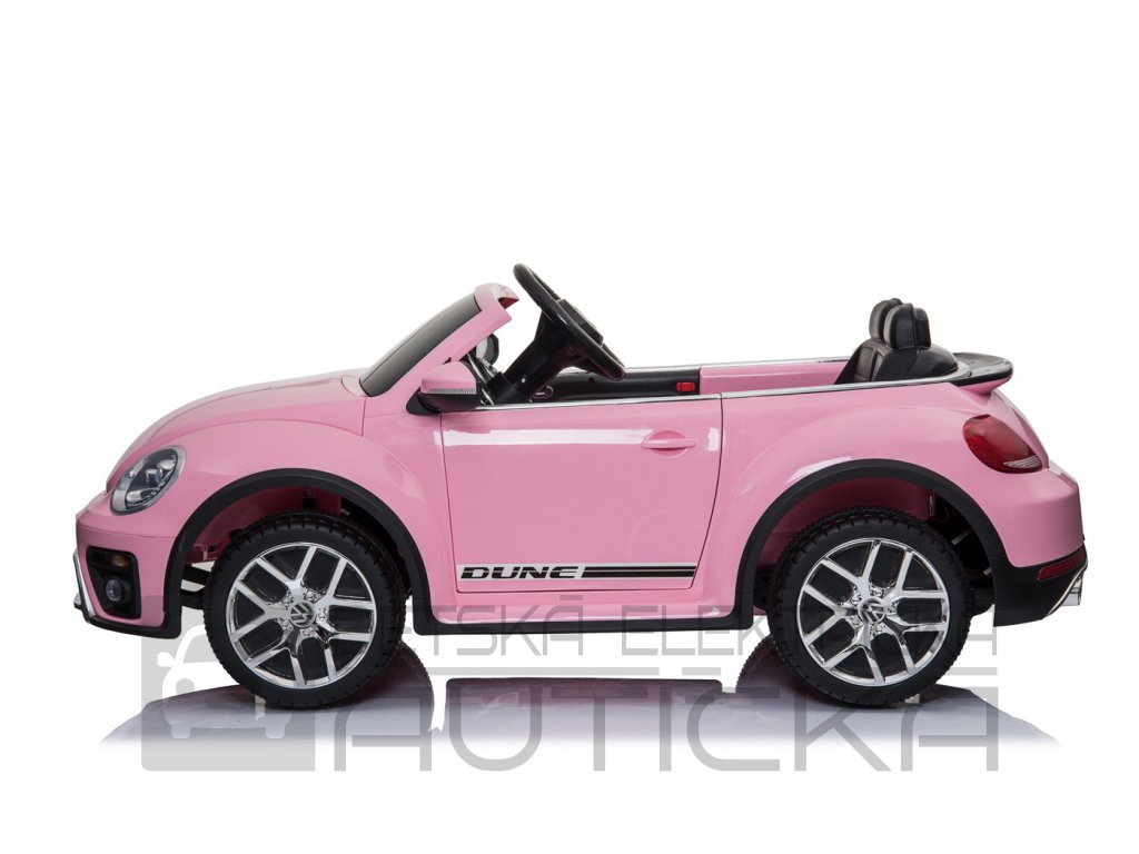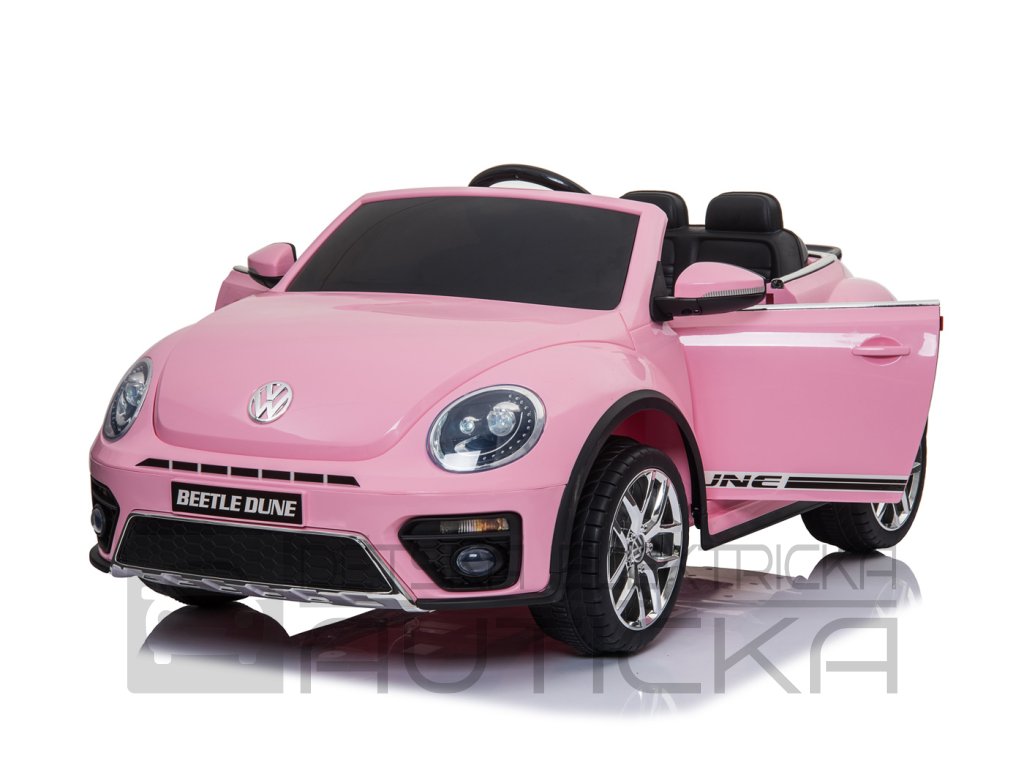 Neotřelý design legendárního Beetla, kvalitní lakovaný materiály a špičkové spracování. To je VW Beetle Dune cabrio se dvěma motory 45W / 12V s náhonem na obě zadní kola (zvládá i jízdu po nerovnostech), pérováním obou náprav a 3 rychlostmi vpřed i vzad. O příjemnou jízdu se starají také krásná čalouněná sedačka a tichá EVA gumová kola.