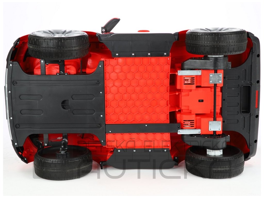 Vozítko má otevíratelné dveře a kapotu, kde najdete úložný prostor. O pohon se starají dva silné elektrické motory o výkonu 45W / 12V a baterie 12V / 7Ah. Pohodlnou a příjemnou jízdu zajistí krom čalouněné sedačky s 3 bodovým bezpečnostním pásem, EVA kola, vyráběné z měkčeného plastu, díky kterým můžete zdolat i jízdu v lehčím terénu. S terénem také pomůže odpružení přední a zadní nápravy.