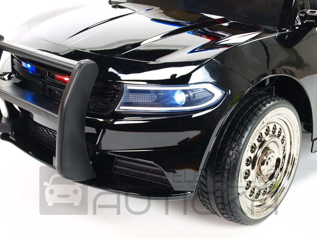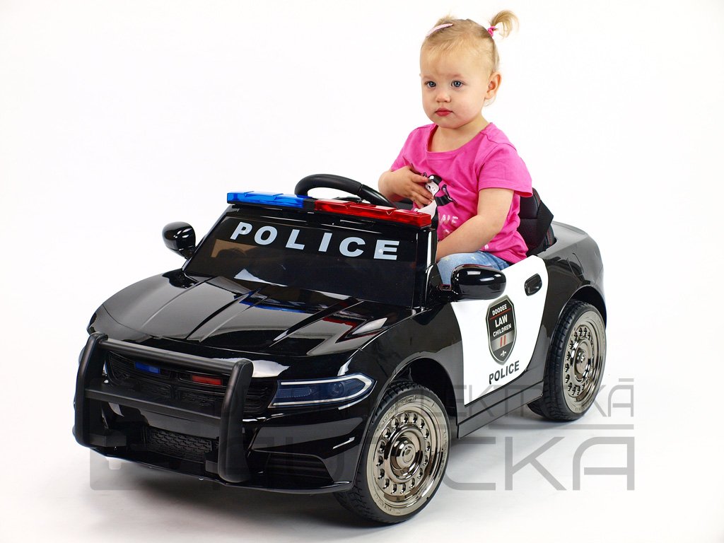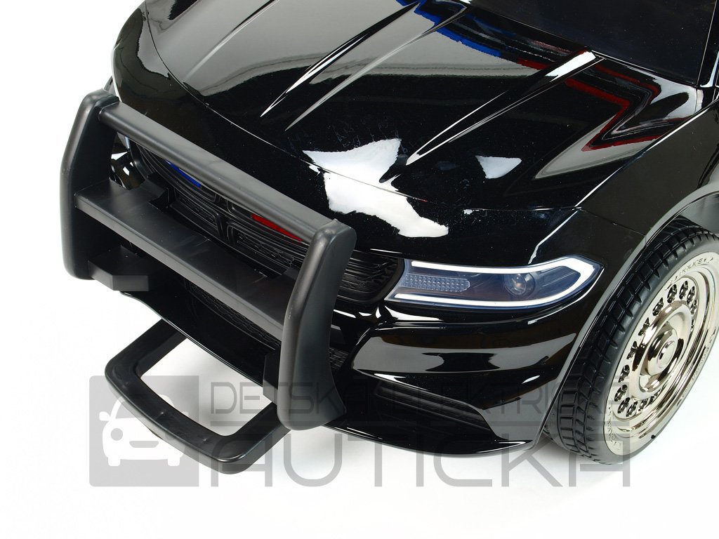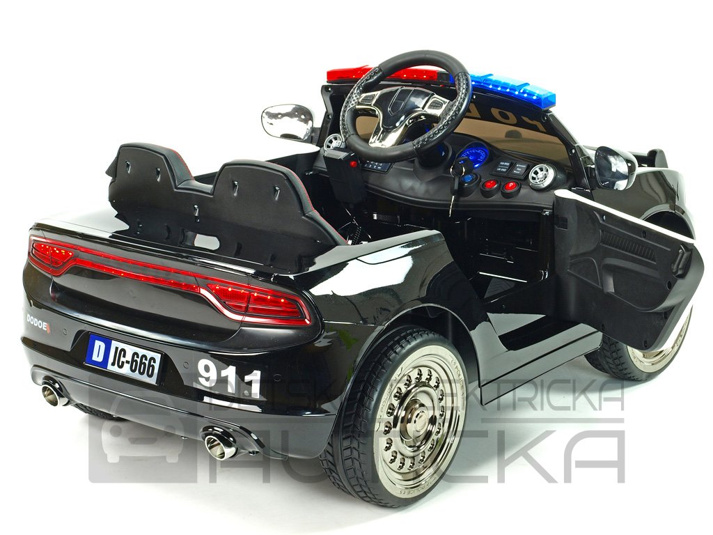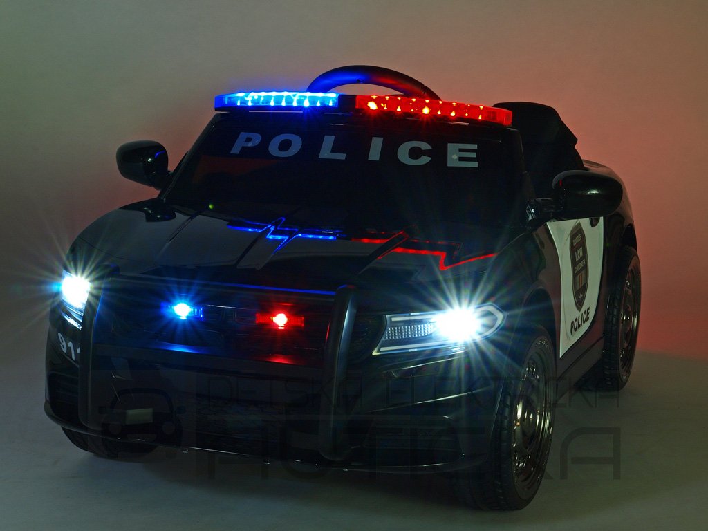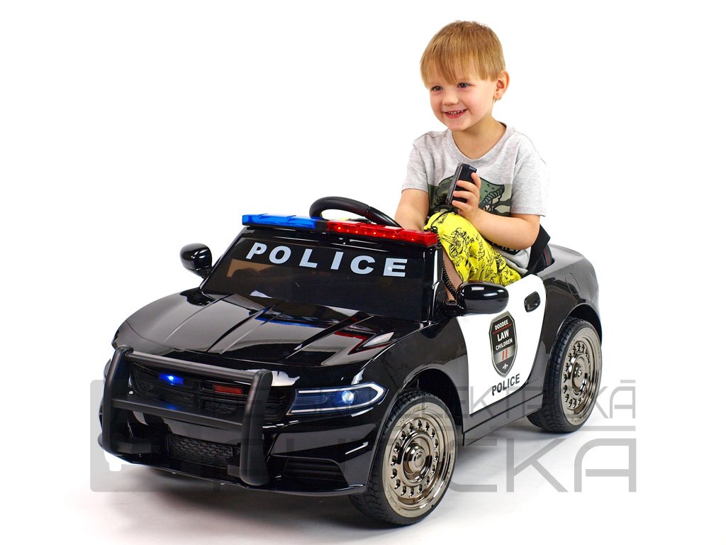 Šikovné dětské elektrické policejní autíčko USA policie střední v černé barvě. Autíčko je možné ovládat buď pedálem, kdy směr jízdy vpřed / vzad a rychlost pomalu / rychle volíte přepínačem na osvětlené přístrojové desce nebo dálkovým ovladačem - vpřed, vzad, pravá a levá, s přednostní jízdou nad pedálem tzn. dítě můžete ovladačem zastavit. Při nesešlápnutém pedálu tah motoru nahrazuje brzdu, při jízdě na DO brzdíte ovladačem.