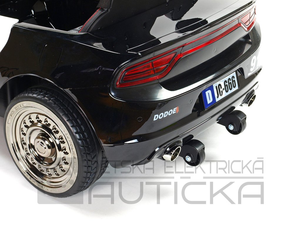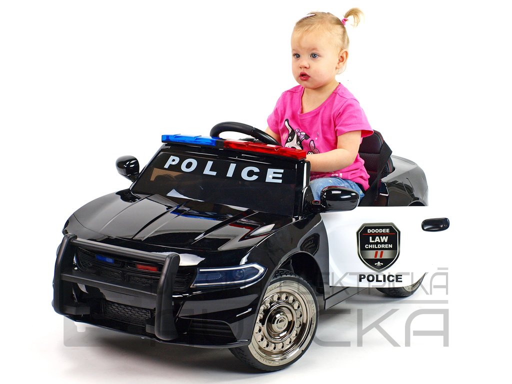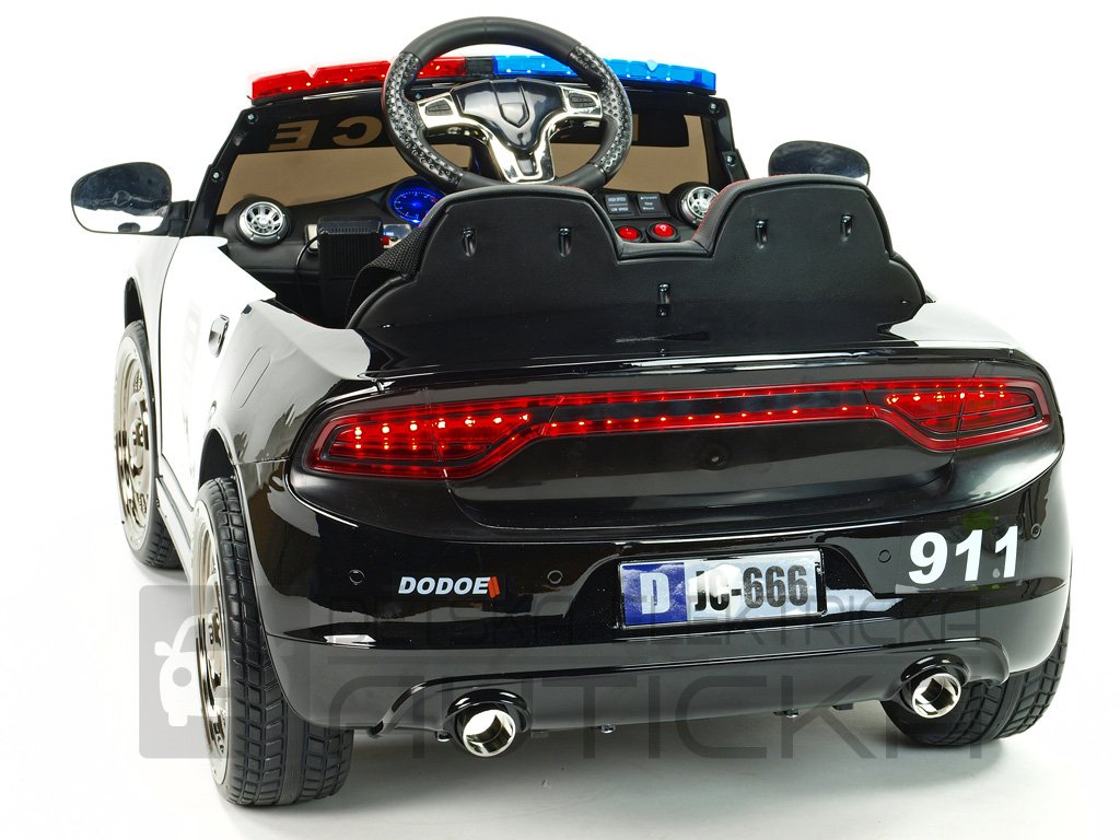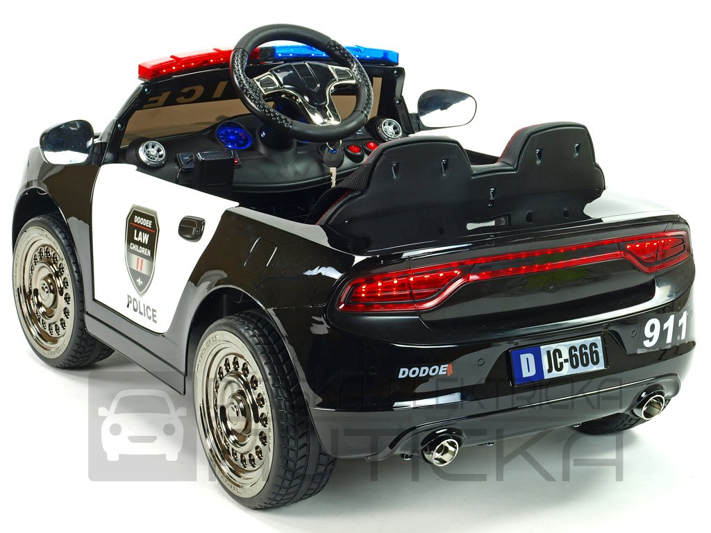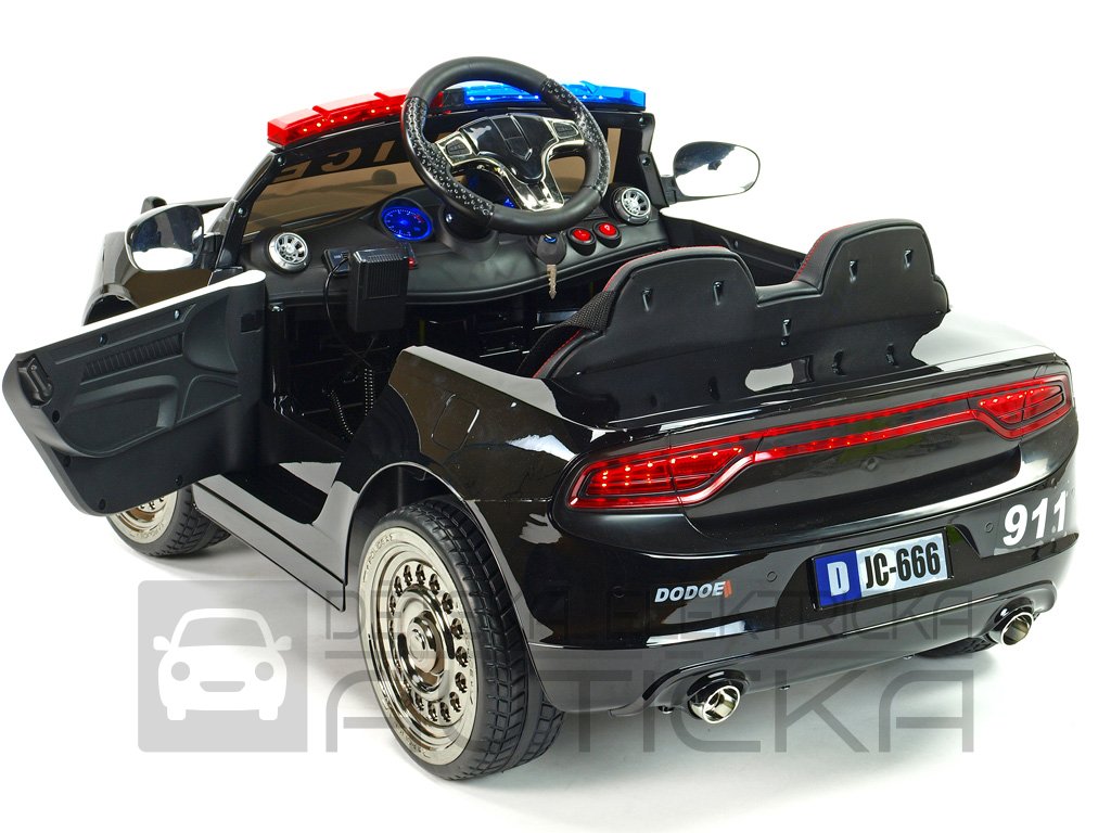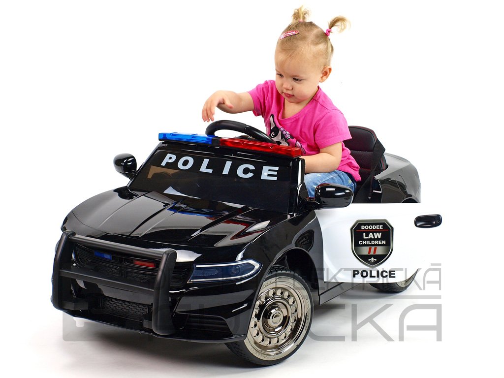 Šikovné dětské elektrické policejní autíčko USA policie střední v černé barvě. Autíčko je možné ovládat buď pedálem, kdy směr jízdy vpřed / vzad a rychlost pomalu / rychle volíte přepínačem na osvětlené přístrojové desce nebo dálkovým ovladačem - vpřed, vzad, pravá a levá, s přednostní jízdou nad pedálem tzn. dítě můžete ovladačem zastavit. Při nesešlápnutém pedálu tah motoru nahrazuje brzdu, při jízdě na DO brzdíte ovladačem.