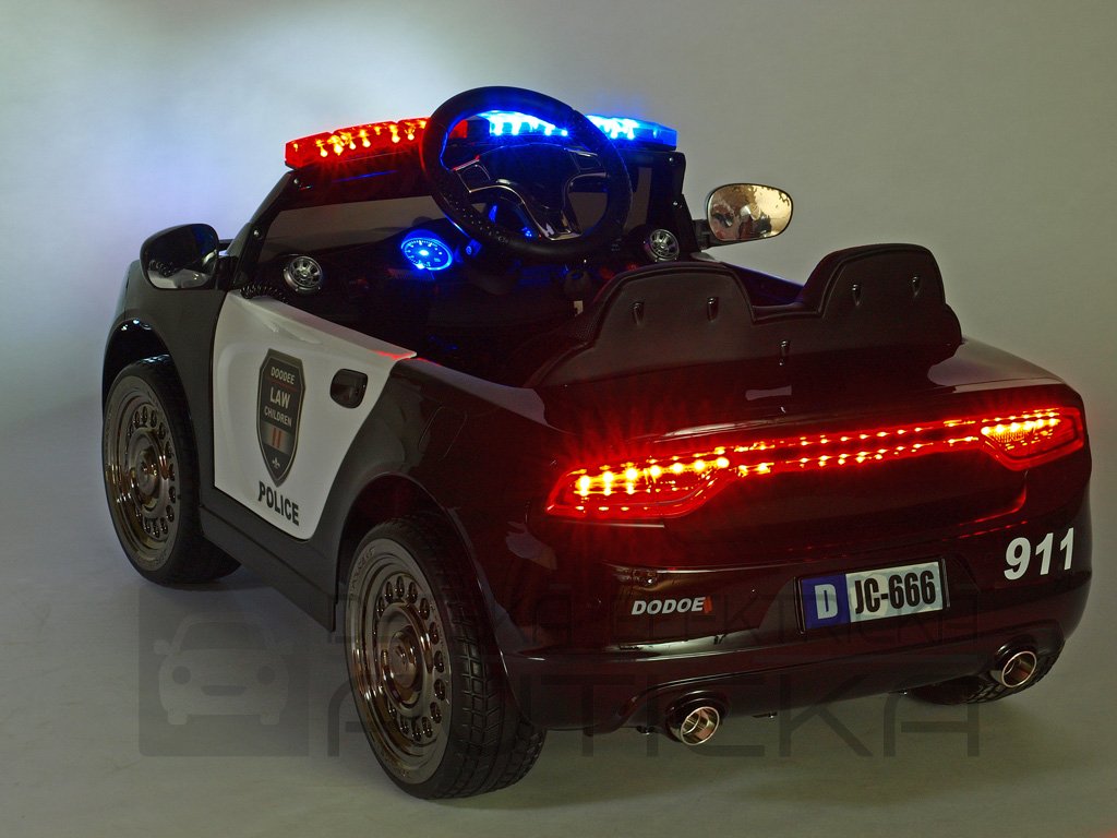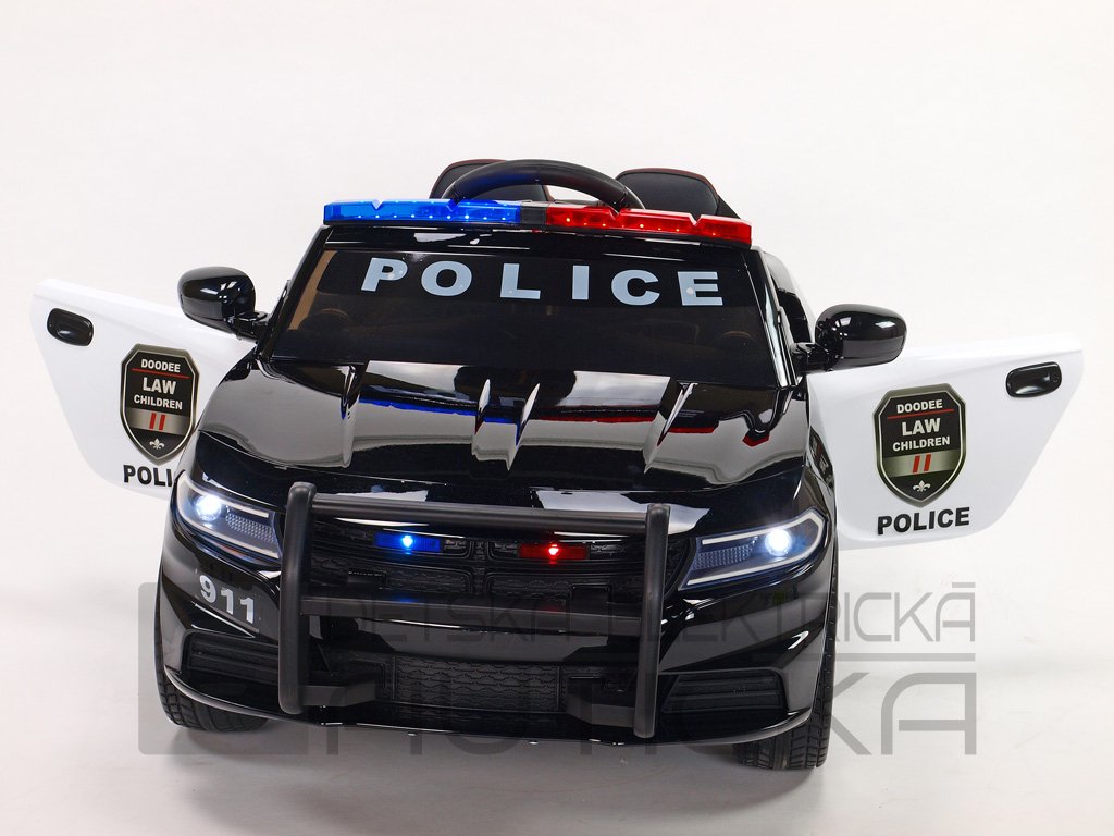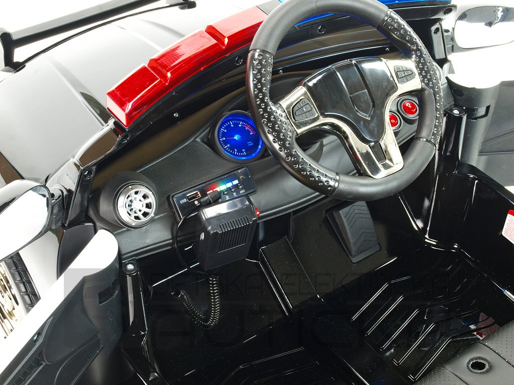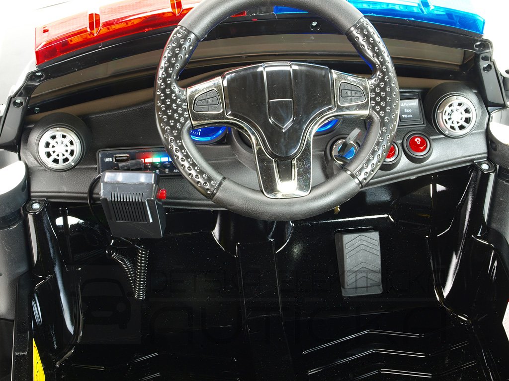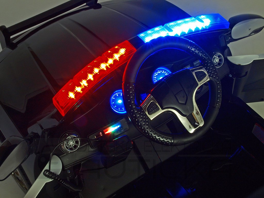 Po zapnutí auta klíčkem zazní start a zvuk motoru. Voltmetr na rádiu ukáže stav nabití baterie. Vypínačem rozsvítíte hlavní a zadní světlomety – vše v LED diodách. Samozřejmostí je přehrávač MP3 s USB s krásným zvukem, kterým volíte vlastní hudbu a hlasitost. K dizpozici je též policejní siréna, majáky a megafon.
